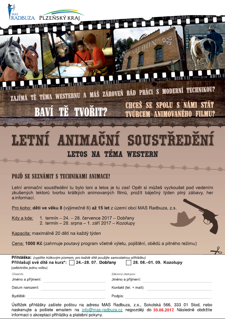 MAS Radbuza pořádá pro děti od 8 do 15 let v termínu 28.8-1.9.2017 animační soustředění, letos v ZŠ Kozolupy.